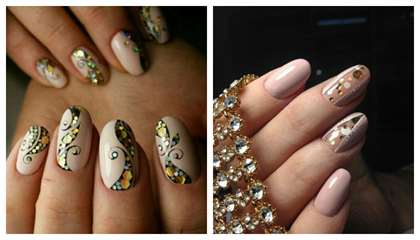 - Сочетание с золотом. Великолепный вариант, который точно не даст нюдовым ногтям «затеряться». При этом в дизайне могут быть использованы золотые блёстки, камифубуки, пайетки, так называемое битое стекло, фольга, может быть выполнена втирка блестящего пигмента. Всё это сделает ноготки особенными и выгодно выделит их обладательницу из общей массы.