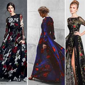 Длинное платье в насыщенных благородных тонах с цветочным принтом подчеркивает женственность и элегантность своей обладательницы, придавая ей нежный и романтичный вид. Для вечернего наряда не подойдут простые рисунки с луговыми цветами; здесь необходимы «королевские» цветы – розы, утонченные орхидеи и камелии. Платья черного цвета с золотыми или серебряными вышивками выглядят очень дорого и эффектно, и в этом случае дорогие украшения не понадобятся – само платье станет ярким акцентом.