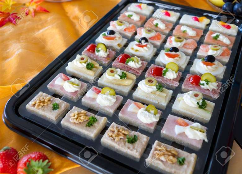 В качестве легких закусок прекрасно подойдут канапе. Это небольшие по размеру закуски, которые состоят из нескольких ингредиентов, соединенных между собой шпажкой или зубочисткой. Можно нарезать продукты кубиком, а некоторые применяют специальные шаблоны, по которым вырезают фигурные детали, например в виде сердца. Можно приготовить небольшие рулеты, которые так же скрепляют шпажками. Все эти кулинарные произведения искусства укладывают в пластиковые контейнеры, которые обязательно должны закрываться крышкой. Их удобно брать в руку, не запачкав пальцы, они сытные, оригинальные и небольшие по размеру. Идеальный вариант для закуски.