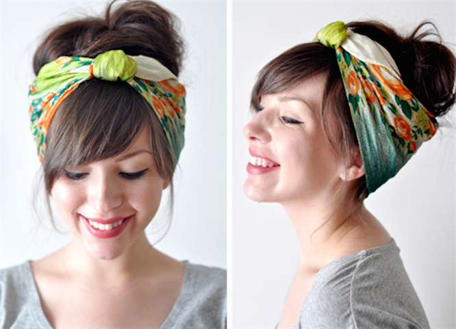 | “А-ля 50-е” | Шарф складывается в полоску, завязывается на макушке бантом или узлом, оставляя челку и часть волос открытыми. | Средней длины, яркие шарфы из хлопка, вискозы, шифона. |