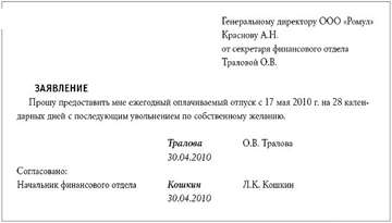 Если сотрудник планирует сначала взять отпуск, а затем уволиться, это также следует отразить в заявлении (это возможно только при наличии неиспользованных дней отпуска). В таком случае составляется заявление на отпуск с последующим увольнением.