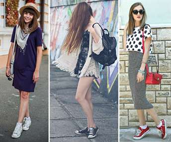 Многих девушек волнует вопрос, носят ли кеды с платьями и юбками? Безусловно, ответ будет положительным. Эта обувь прекрасно сочетается с пышной юбкой, джинсовым платьем, платьем-майкой или моделью типа рубашки.