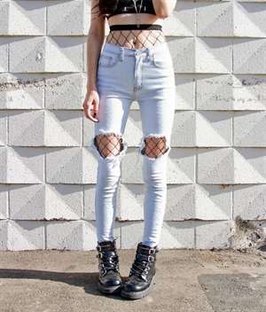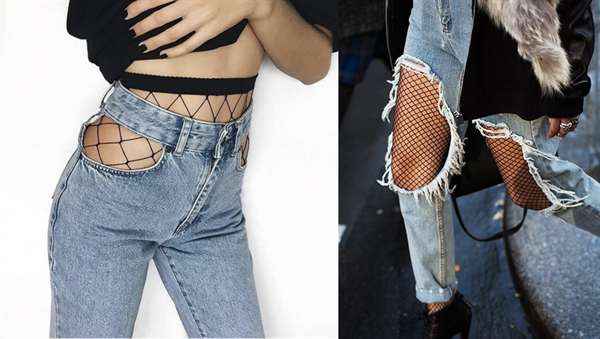 Довольно стильно выглядят чёрные джинсы и колготки в сетку. Это более повседневный вариант, и он не выглядит таким брутальным, как предыдущий.
