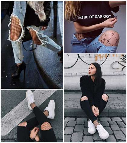 Рваные джинсы с колготками в сетку смотрятся просто потрясающе. Общие рекомендации по носке такие же, как и в случае с обычными джинсами. Образ получается очень брутальным и сильно пацанским, а это именно то, что сейчас предпочитают современные девушки.