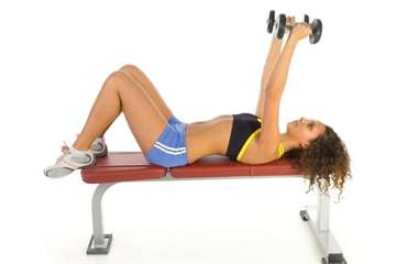 Начальное положение: лягте на пол на спину, руки с гантелями (по 1,5 кг) разведите в стороны. Поднимайте прямые руки вверх, одновременно делая глубокий вдох. На выдохе опускайте руки, при этом они должны оставаться прямыми. Если гантелей нет, можно использовать две бутылки по 1,5 литра, наполненные водой или песком. Выполняйте это упражнение 15 раз, постепенно увеличивая количество повторений.