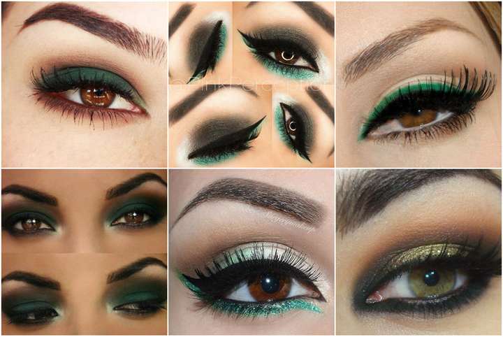 Основной оттенок макияжа – изумрудный или зеленый. Этот цвет гармонично сочетается с с коричневым или золотистым. Он изумительно подойдет для карих глаз. Нижнее веко стоит подвести коричневыми тенями, причем начать стоит со складки. Тушевка не должна быть заведена слишком высоко в том случае, если представительница прекрасного пола является обладательницей большого неподвижного века.