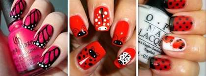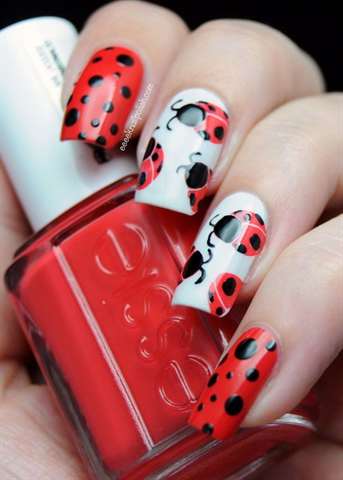 | Создание “божьей коровки” | 1. Нанесите красный лак на все ногти (или на те, где будет рисунок). 2. Высушите красный лак. 3. С помощью дотса или тонкой кисти нарисуйте черную “голову” божьей коровки у основания ногтя. 4. Той же кистью или дотсом нарисуйте черную линию, разделяющую “спинку” пополам. 5. Нарисуйте черные точки на красной части ногтя. 6. Высушите черный лак. |