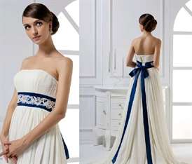 - Пояс шириной 8-11 см подходит девушкам-пышкам, подчеркивая и сужая талию. Такой пояс лучше сделать контрастным платью, тогда невеста будет выглядеть еще стройнее.