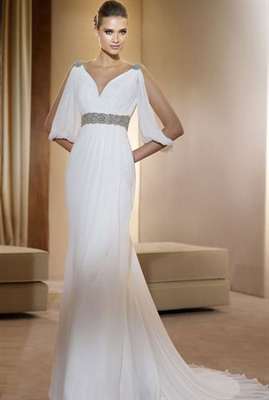 - Под грудью. В этом месте пояс будет хорошо смотреться с платьем в греческом стиле или с завышенной талией. Такой пояс поможет скрыть небольшой живот, если невеста не желает афишировать свое интересное положение.
