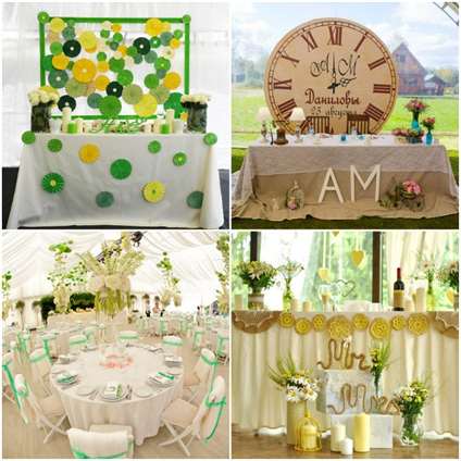 Для декорирования зала и стола применяют не только живые цветы, но и украшения из бумаги, лент, ткани. Украсить фон за столом молодых можно собственноручно изготовленными цветами. Из гофрированной бумаги создаем всевозможные цветки, бутоны, листики и крепим на ткань нужного цвета, создавая уникальную цветочную композицию в цветовой гамме торжества. Такое оформление будет уникальным и неповторимым, ведь вы создавали его руководствуясь только своей фантазией. На стол молодоженов можно поставить небольшие букетики из живых цветов.