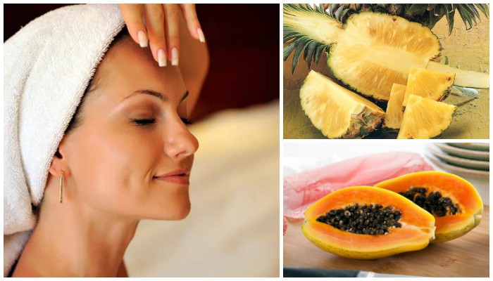 - Тропическая. Это очень полезная маска, благодаря содержанию витаминов и фруктовых кислот, она хорошо очищает и освежает. Готовится из двух видов тропических фруктов – ананаса и папайи. Пюре из фруктов накладывают на лоб, смывают через двадцать минут.