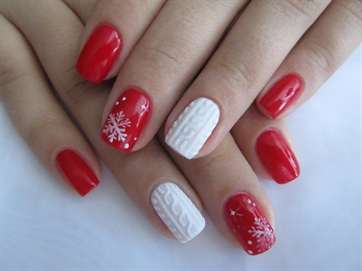 Белые снежинки можно легко нарисовать на красном фоне с помощью тонкой кисточки. Это не займет много времени и усилий. Также можно дополнить маникюр вязаным узором на безымянном пальце.