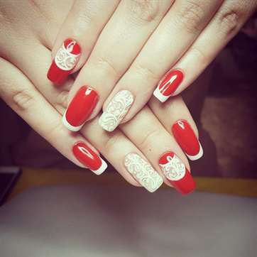 Совместить французский и лунный маникюр – закрасить белым цветом «лунки» красного ногтя.