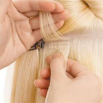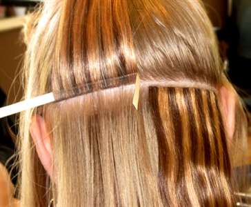 - Затем происходит процесс приклеивания тонких искусственных или натуральных прядей к волосам клиентки.