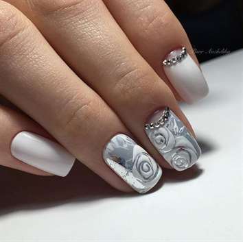 Маникюр с рисунком розы в светлых тонах часто выбирают невесты. В этом случае дизайн может быть представлен такими вариантами.