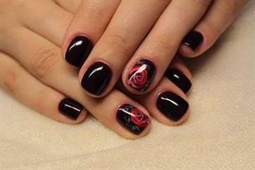 В темные оттенки можно внести яркие акценты, выбрав красный маникюр: с изображением роз он будет выглядеть просто великолепно, ведь цветы именно такого цвета встречаются в природе чаще всего.