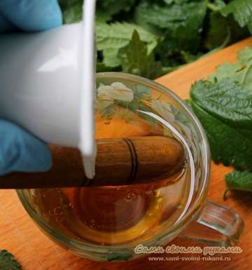 Его очень просто приготовить. Оборвите листочки крапивы, измельчите их ножом и залейте кипятком на 30-60 минут. Полученный настой надо процедить через сито и ополоснуть им волосы после мытья.