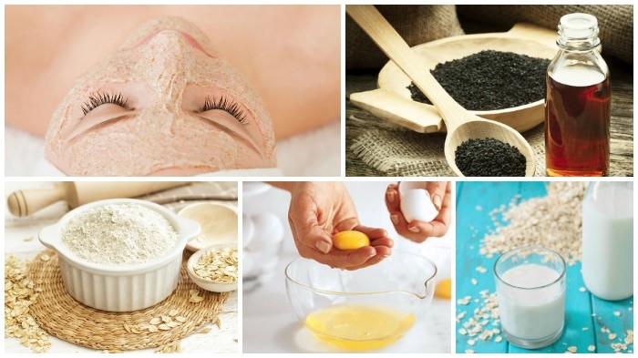 Этот состав иногда называют маской Клеопатры. Неизвестно, пользовалась ли знаменитая египетская царица данным рецептом, но наши современницы подтверждают его эффективность. Столовую ложку измельченных до состояния муки овсяных хлопьев развести теплым молоком до состояния густой кашицы. Отдельно смешать 5 мл масла из семян черного тмина с чайной ложкой жидкого меда и сырым желтком. Перемешать приготовленную смесь с овсяной кашицей.