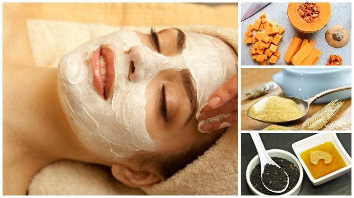 Кусочек очищенной тыквы нужно натереть на самой мелкой терке или измельчить в блендере. На две столовые ложки овощной массы добавить 5 мл масла из семян тмина и около ложки манной крупы. Крупу подсыпать постепенно, добиваясь, чтобы масса настолько густой, чтобы её было удобно наносить. Смывать через четверть часа после нанесения.
