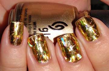 Через пять часов покрываем металлическую поверхность прозрачным лаком, чтобы маникюр продержался как можно дольше. На фото можно увидеть, как эффектно выглядят ногти, оформленные таким способом. Учитывая разнообразие расцветок и узоров фольги, можно создать уникальный дизайн ногтевого покрытия.
