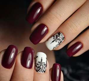 Самым актуальным является однотонный вишневый маникюр, декорированный узором или рисунком на одном акцентном ногте.