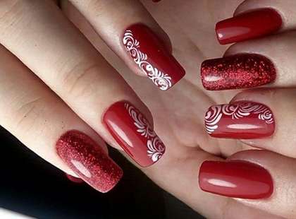 Красный цвет в маникюре лучше всего сочетается с белым, черным, розовым и золотистым.