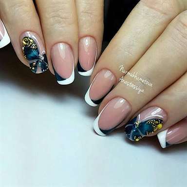Ярко-синий френч в сочетании с прозрачной или светлой пастельной основой выглядит потрясающе, особенно если на одном из акцентных ногтей изображена бабочка в синих и голубых тонах.