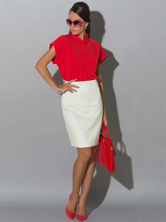 Удачным сочетанием с белой юбкой-карандаш является блузки в обтяжку насыщенных фиолетовых, кобальтовых, коралловых цветов, а также глубоких зеленых.