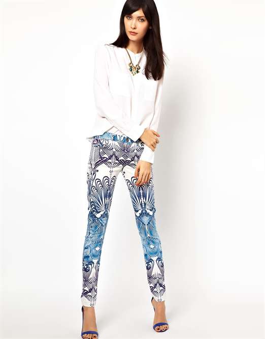 С джинсами с принтом можно создать строгий образ или приблизиться к классике. Выберите геометрический рисунок, дополните его блузой пастельного тона. А женственности и нежности образу придадут джинсы с абстрактным рисунком в паре с шелковой блузой. А завершить такой образ поможет жакет, по цвету подобранный к основному тону брюк.