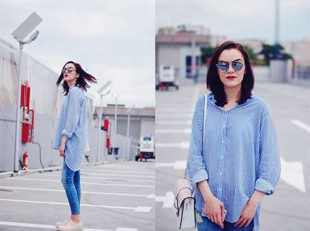 Для обладательниц стройной фигуры создание стильного образа с полосками не составит труда. Достаточно обратить внимание на длинную полосатую рубашку, которая может заменить короткое платье и добавить романтики в ваш наряд для прогулки по набережной.