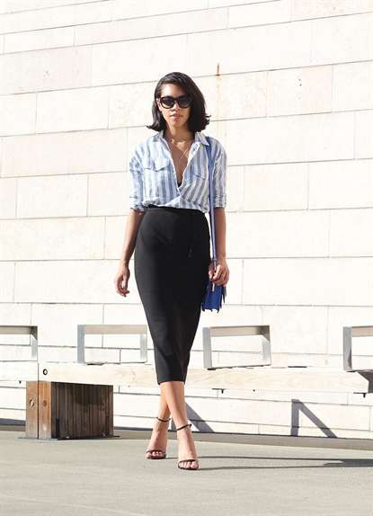 Безусловно, многие знают, что вертикальные полоски визуально делают фигуру более стройной. Полосатая рубашка в сочетании с юбкой-карандаш только усилит этот эффект. Оптимальным вариантом станет однотонная юбка, которая прекрасно будет сочетаться с модными туфлями-лодочками в цвет рубашки. Если вы хотите добавить немного смелости и выбрать юбку с рисунком, пусть это будет яркий принт, главное — найти общий элемент, который свяжет образ.
