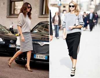 - Юбка-карандаш. Наиболее подходящая модель. Узкий крой визуально уравновесит эффект мешковатого верха.