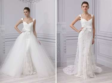 Пышные свадебные платья-трансформеры позволяют в нужный момент убрать верхнюю объемную часть, под которой скрывается, например, короткая юбка-футляр. В этом случае верхняя юбка может быть накладной. Это не только эффектный, но и практичный и удобный вариант.