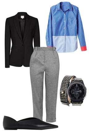 Для сотрудников офисов отлично подойдет лаконичный ансамбль, состоящий из серых брюк, белой рубашки и короткого черного пиджака. Бабуши выбирайте в цвет пиджака. Вместо классической белой рубашки можно рассмотреть вариант с мелкой вертикальной полоской синего или черного оттенка. Туфли-бабуши с закрытой пяткой будут удобны и не будут спадать. Посмотрите на фото ниже.
