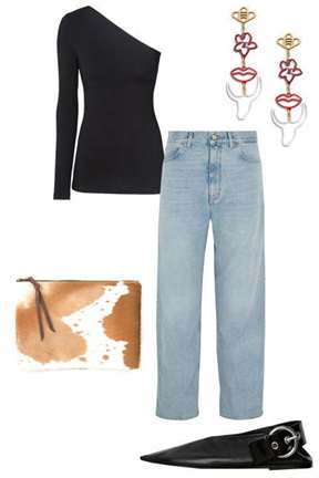 Например, голубые прямые брюки из джинсовой ткани, в сочетании с черной кофточкой, которая будет с одним открытым плечом. Все можно дополнить сумкой из светлой кожи. Если вы любите бижутерию, то можно использовать сережки в стиле «бохо». Туфли подойдут черного цвета с открытой пяткой.