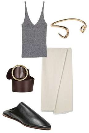 Отлично будет выглядеть кремовая юбка средней длины в сочетании с серым топом в бельевом стиле. Черные бабуши станут удачным дополнением. Образ можно завершить коричневым широким ремнем и золотым браслетом.