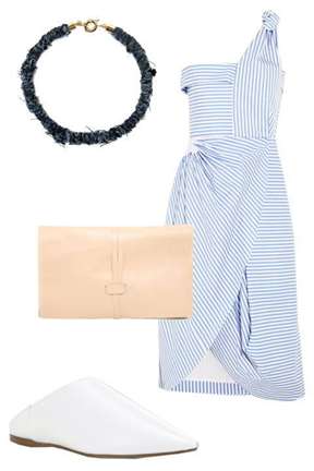 - Красивое легкое платье в морской тематике, хорошо будет сочетаться с белыми туфлями. Сумка клатч подойдет кремового оттенка. Не забудьте все дополнить красивыми аксессуарами;
