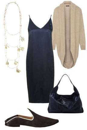 Отличным вариантом станет черное платье-комбинация в паре с бежевым кардиганом. Обувь и сумочка лучше выбрать в темных тонах. Образ можно дополнить золотыми украшениями.