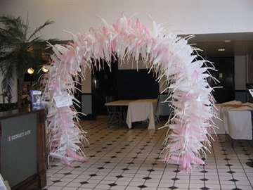 Они должны быть большие и с широким дном, так они будут устойчивее. Залить в них гипс и согнув трубу в виде подковы вставить концы в емкости. Застывает смесь около двух суток. Когда каркас будет готов, нужно с помощью двустороннего скотча прикрепить к нему ткань, создав иллюзию стекания. Самый ответственный момент – декорирование арки цветами. Основные букеты располагают у основания и в центре арки. От центра по бокам для целостности композиции крепим несколько бутонов.