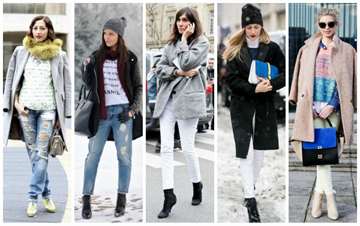 В зимний период можно подобрать разнообразные варианты верхней одежды к джинсам, ориентируясь на общий стиль. Джинсы-бойфренды отлично смотрятся в сочетании с классическими пальто спокойных оттенков и массивными ботинками. Прямые джинсы гармонично дополняются короткими куртками или пуховиками. Обтягивающие джинсы лучше всего комбинировать с сапогами-ботфортами, а широкие джинсы – с ботинками или ботильонами.